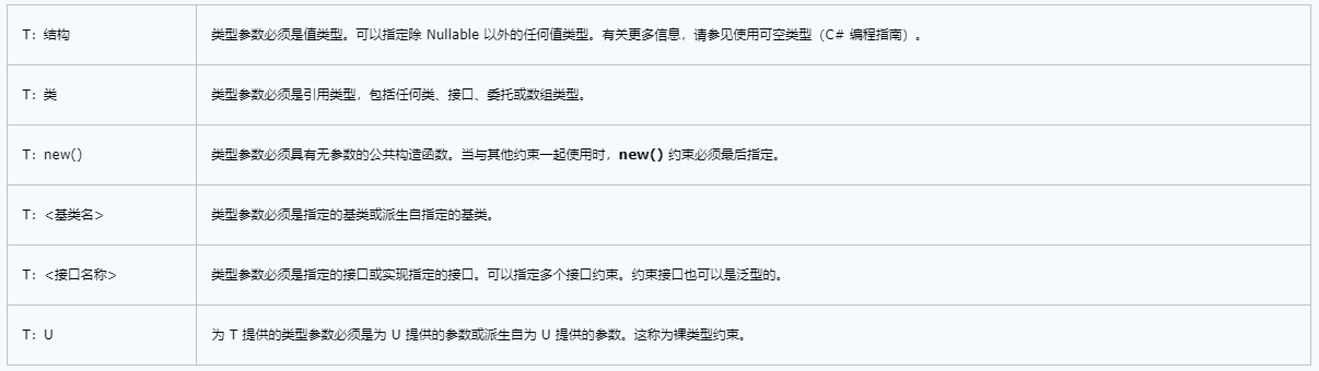 一个泛型参数可以至多拥有一个主要约束,主要约束可以是一个引用类型、class或者struct。如果指定一个引用类型,则实参必须是该类型或者该类型派生类型。class规定实参必须是一个引用类型。struct规定了参数必须是一个之类新。