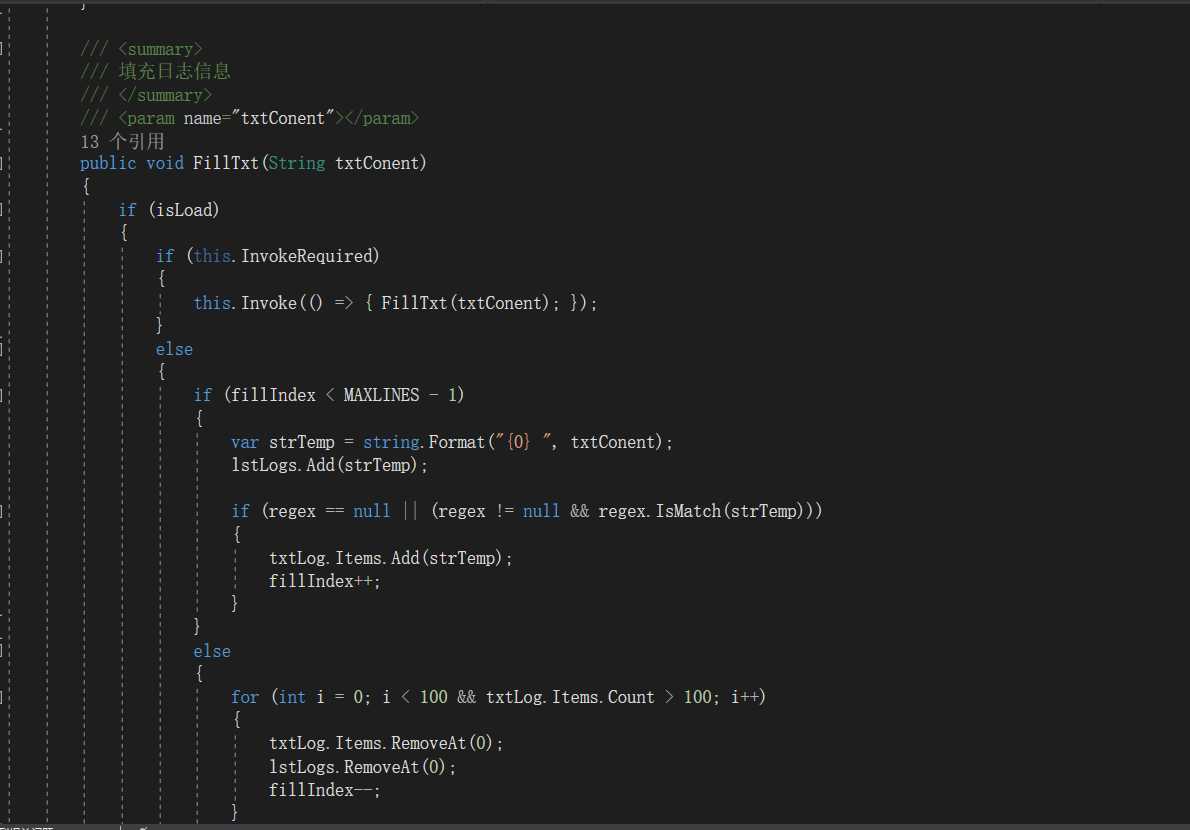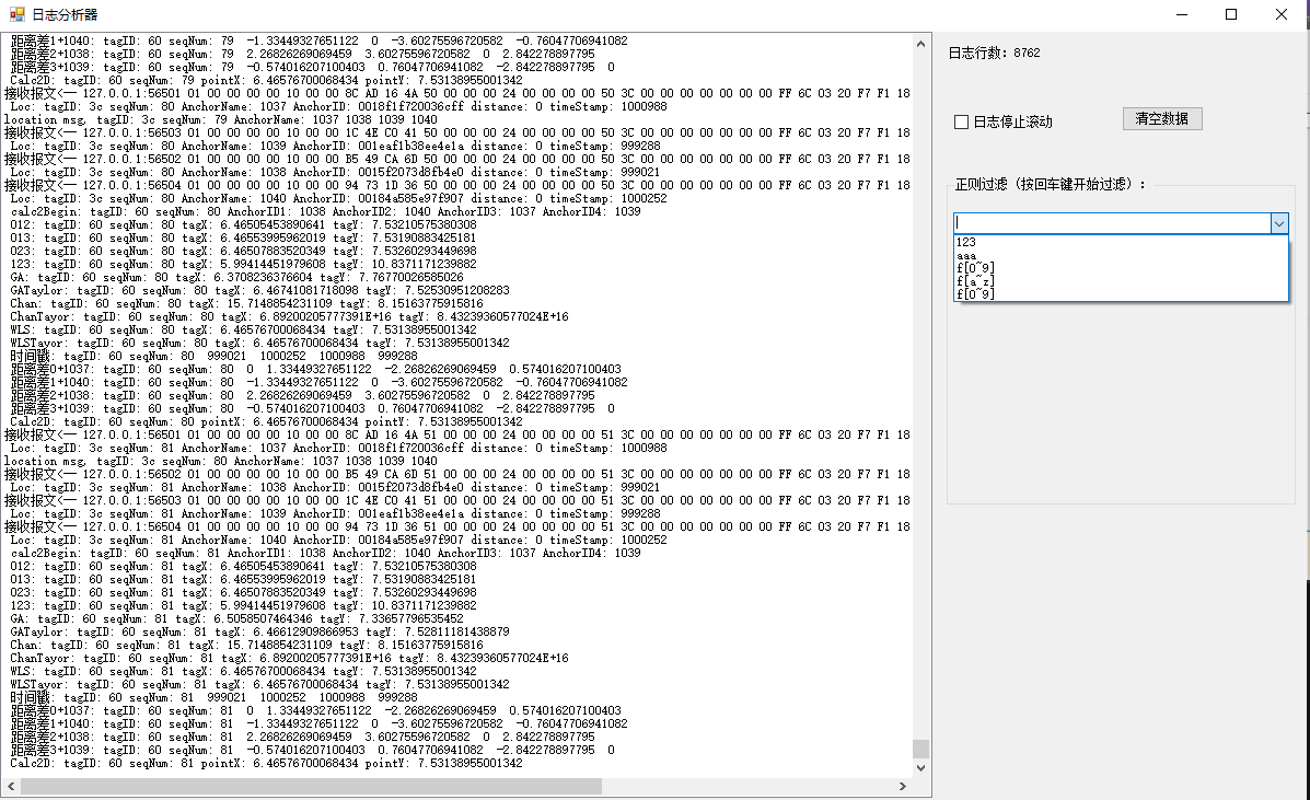 为了解决实时显示日志与日志持久化保存的矛盾,开发了一个日志分析器,可以在调用log4net进行持久化操作前,加入一个窗体打印函数调用,先进行窗体上显示,再做持久化保存。本日志分析器另一个优点是,窗体上的日志分析是支持正则表达式的,可以按任意正则条件进行过滤。支持多次反复过滤查询、支持日志驻停、 支持历史查询选项,支持日志条数清理(超过最大日志行数将依次清除最早的100行),支持复制导出。